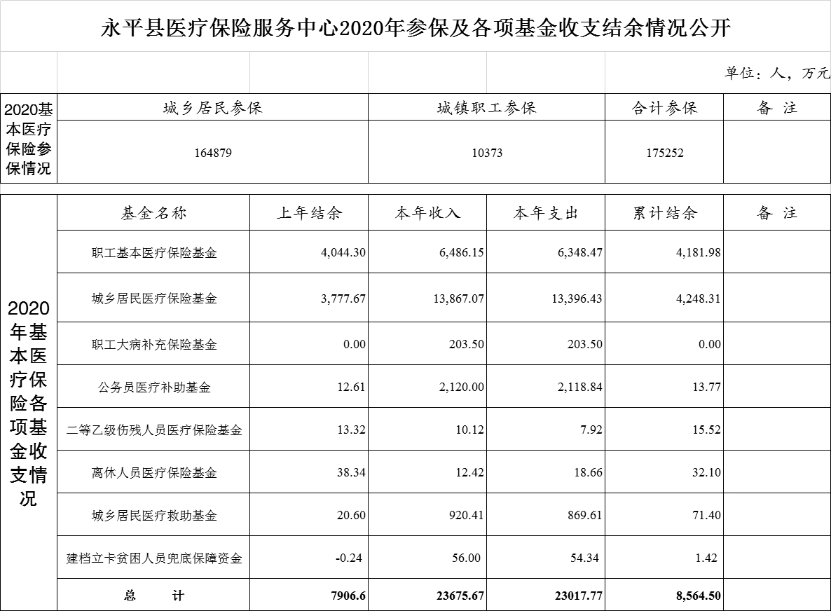 大理市永平縣醫(yī)療保險服務(wù)中心2020年參保及各項基金收支結(jié)余情況公開