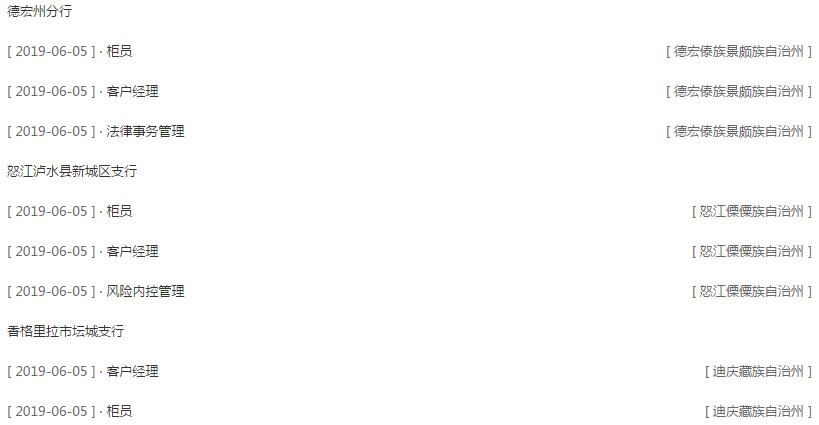 其中,怒江瀘水縣新城區(qū)支行、迪慶香格里拉縣壇城支行招聘學(xué)歷條件為具有國家統(tǒng)招的普通高等院校大學(xué)?疲ê┮陨蠈W(xué)歷。